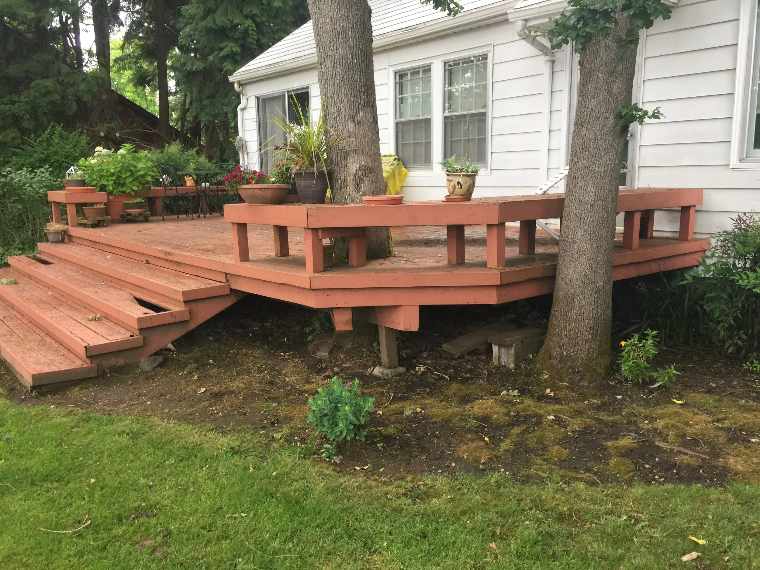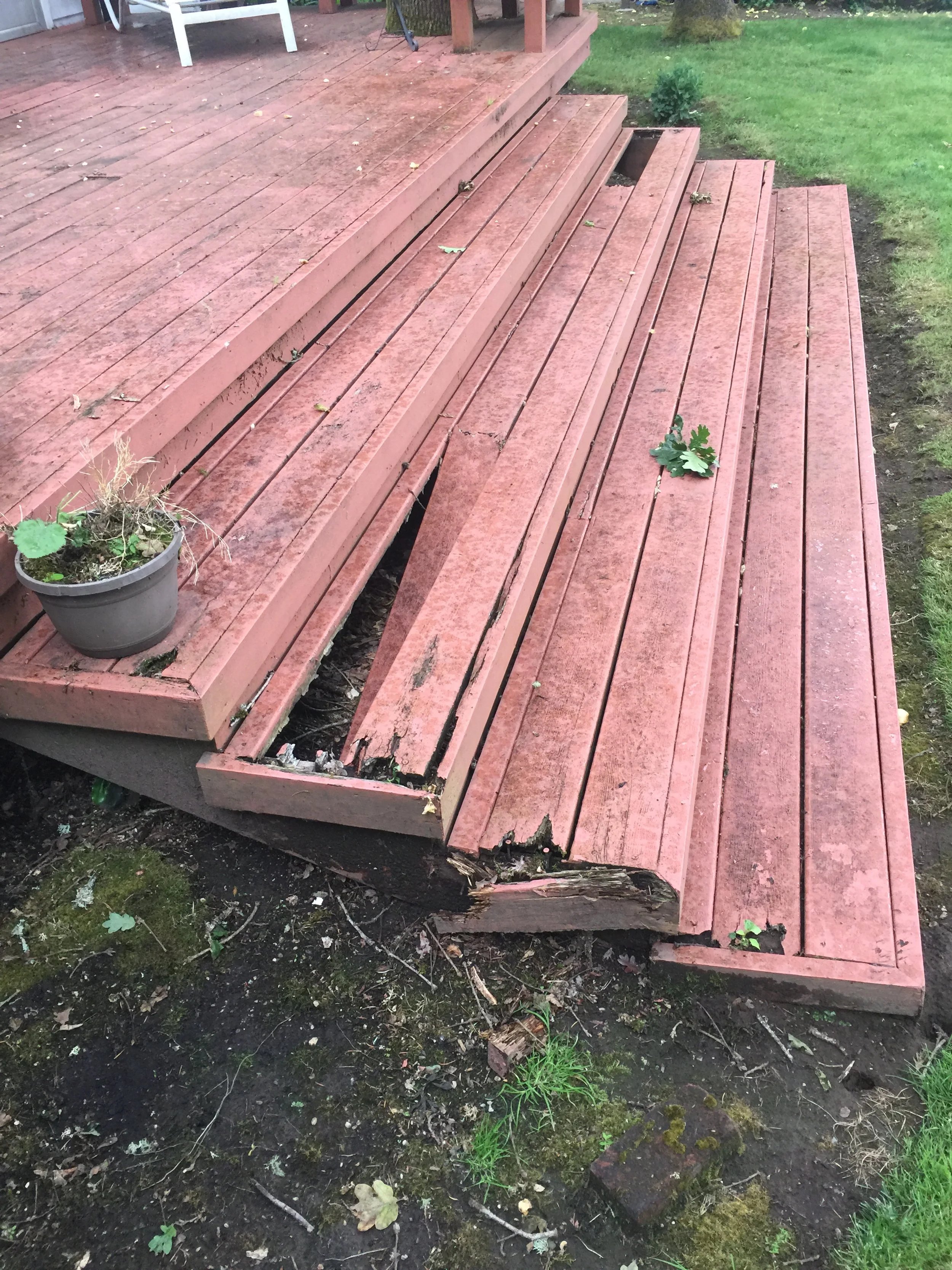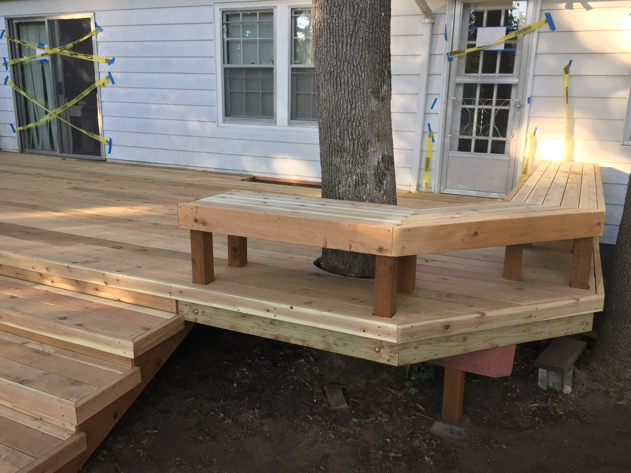 Deconstructed entire structure and rebuilt stairs, decking and bench seat.